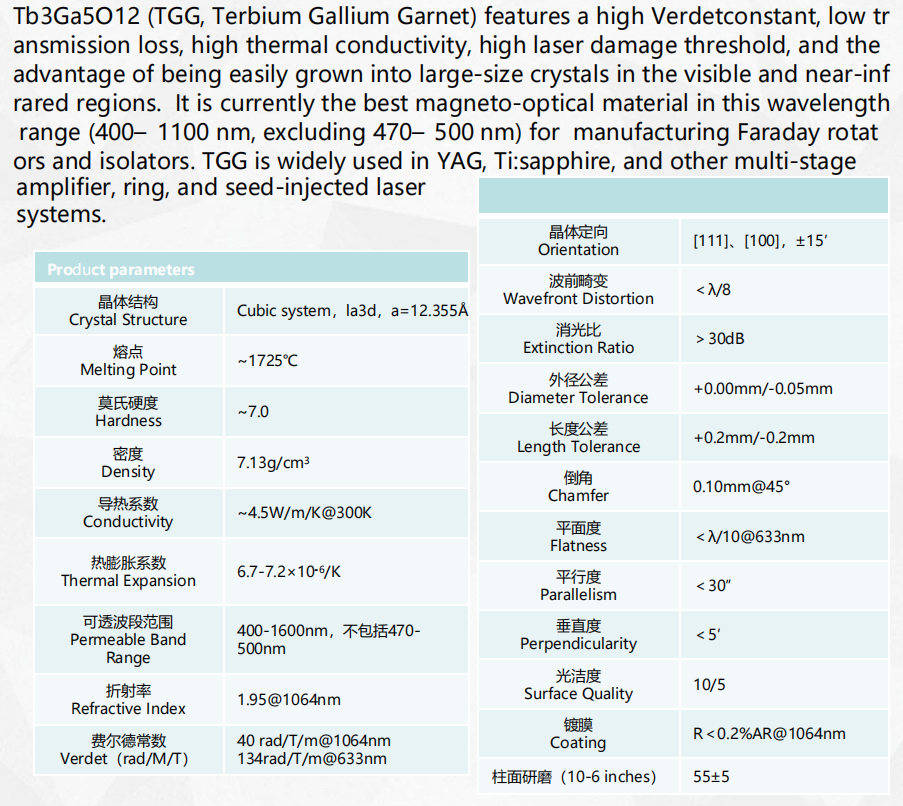 Tb3Ga5O12 ( 苏州TGG,镓石榴石) 在可见和近红外光区具有较高的费尔德常数、低的透射损耗、 高热导率和高苏州激光损伤阈值及易生长大尺寸晶体等优点, 是目前这一波段 (400-1100nm, 不包括470nm-500nm) 用于制作法拉第旋光器与隔离器的最佳磁光材料, 广泛应用于YAG、 掺Ti蓝宝石等多级放大、 环形及种子注入激光器中。